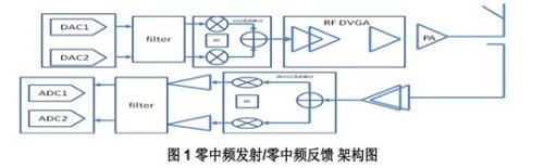 圖 1 為零中頻發(fā)射及零中頻反饋的架構(gòu)圖,其中調(diào)制器(modulator)的輸入頻點(diǎn)為零,解調(diào)制(demodulator)的輸出頻點(diǎn)為零,就稱為零中頻發(fā)射和反饋。